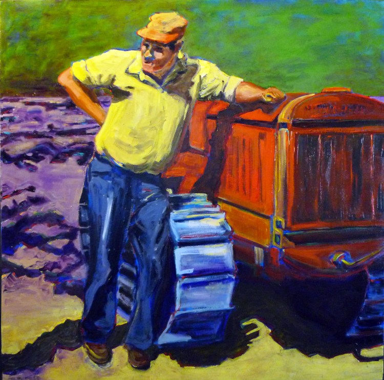 The fourth in a series of paintings depicting my father and his tractor, circa 1959. Erik G., take note: now that this body of work has become my chef d’oeuvre, each piece is more “important.”