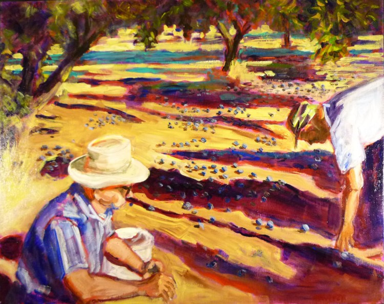 This is the first in a series of paintings honoring the days when Healdsburg was the “Buckle of the Prune Belt.” It’s from a photo of my Dad (right) and his friend from school days, Guerdon Miller, picking prunes in about 1985. My Dad liked farming but he hated picking prunes. I imagine they were picking the beginnings or the tail-end of the crop, when there weren’t enough prunes to call in the professionals.