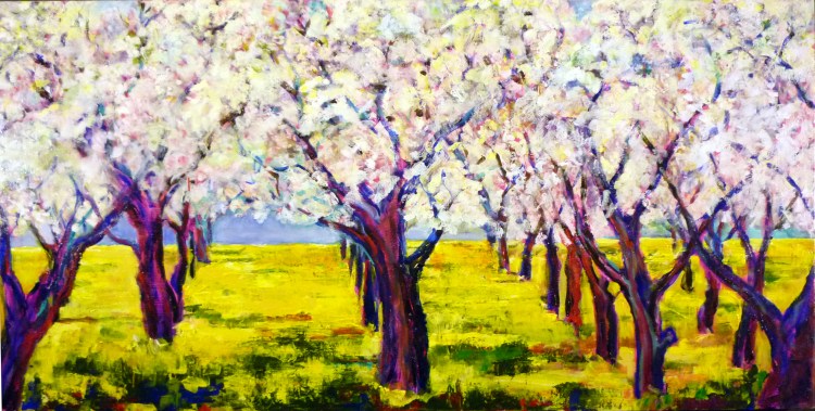 The newest in my “prune” series depicts trees in full blossom with a carpet of bright mustard weeds.