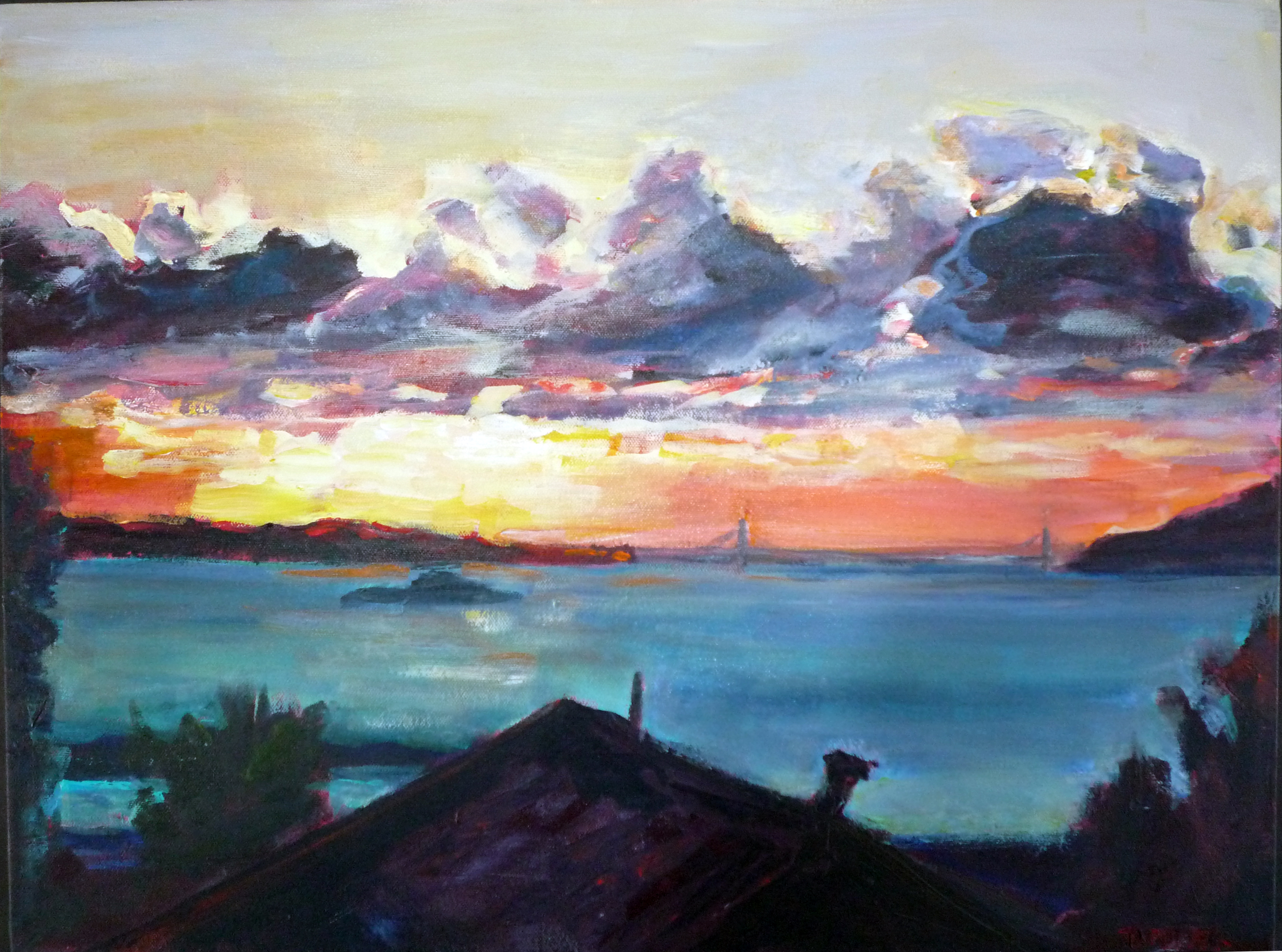 I’ve painted two versions of one stormy sunset over the San Francisco Bay. One will be placed in the Berkeley Art Center Member show entitled Shine. I’m soliciting advice about which painting people like better. So, what is your vote?
