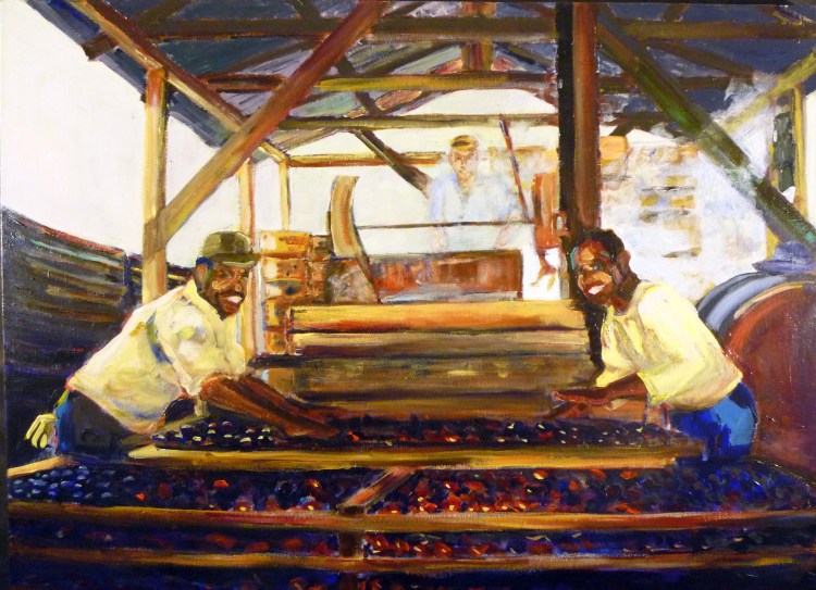 Some of my recent paintings document those harvest days. At The Dipper shows my father and our two “day men,” Moses and Sylvester, at the dipper. Before the prunes went into the dehydrator, they were dipped in hot lye water. I always thought it was just a way to wash them. But recently a friend told me this lye bath changes the prunes’ skin so they will dry properly, shriveling with the meat instead bloating up during drying.