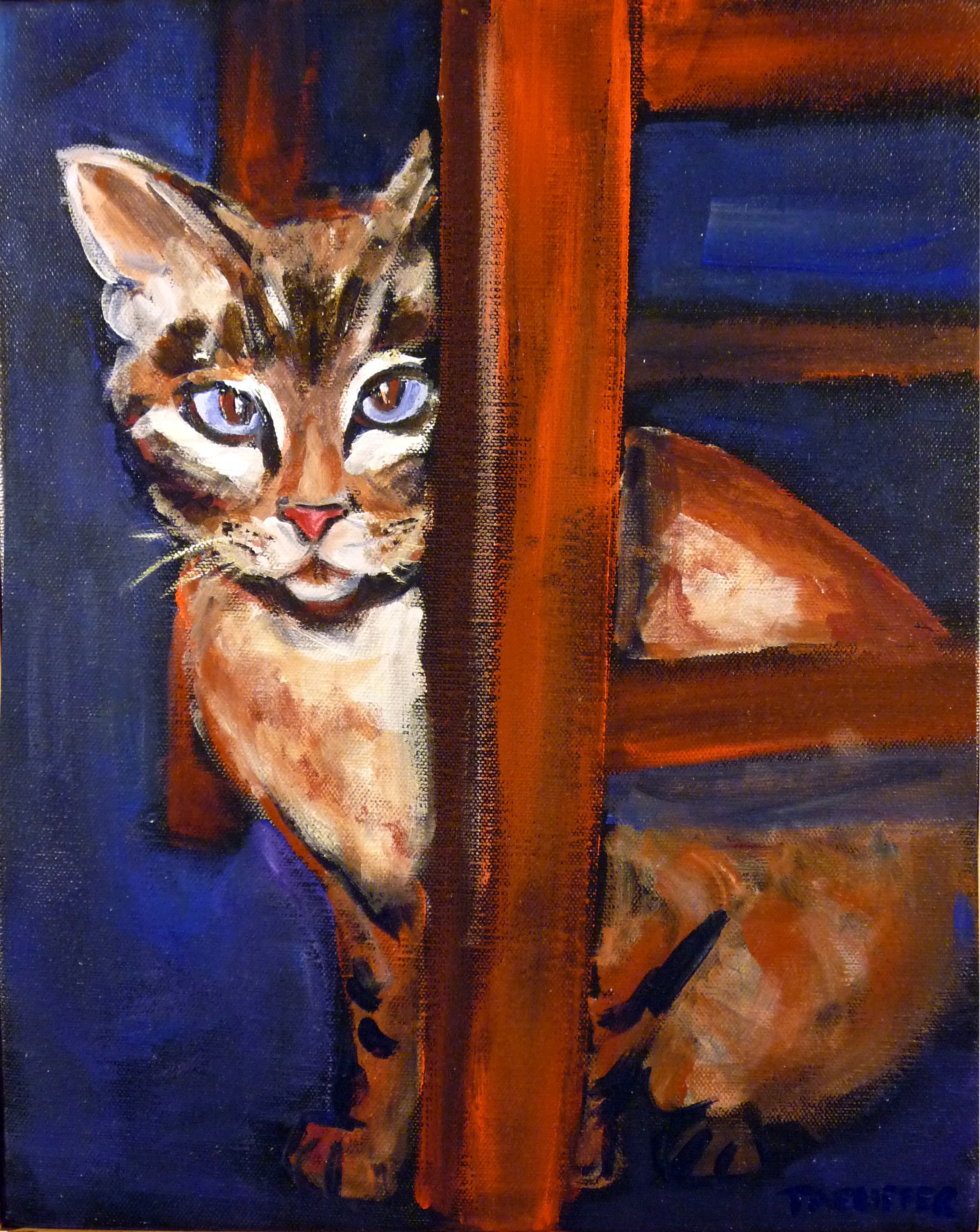 I’m a lot like YouTube. The viewers there can’t get enough of them cat videos and I can’t do enough of them cat paintings. Here’s the latest, a portrait of Rufus, the cat who owned my sister and her husband for many years. Crossed eyes and all. This was my brother-in-law Michael’s birthday gift.