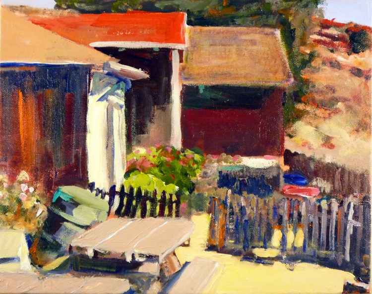 When I got back to the studio, I happily painted a China Camp scene employing Tim’s big ideas: use the pattern of shadows as the basis for the painting, then use warm colors to bath your scene in light and let cool colors contribute that chilly feeling of shadow.