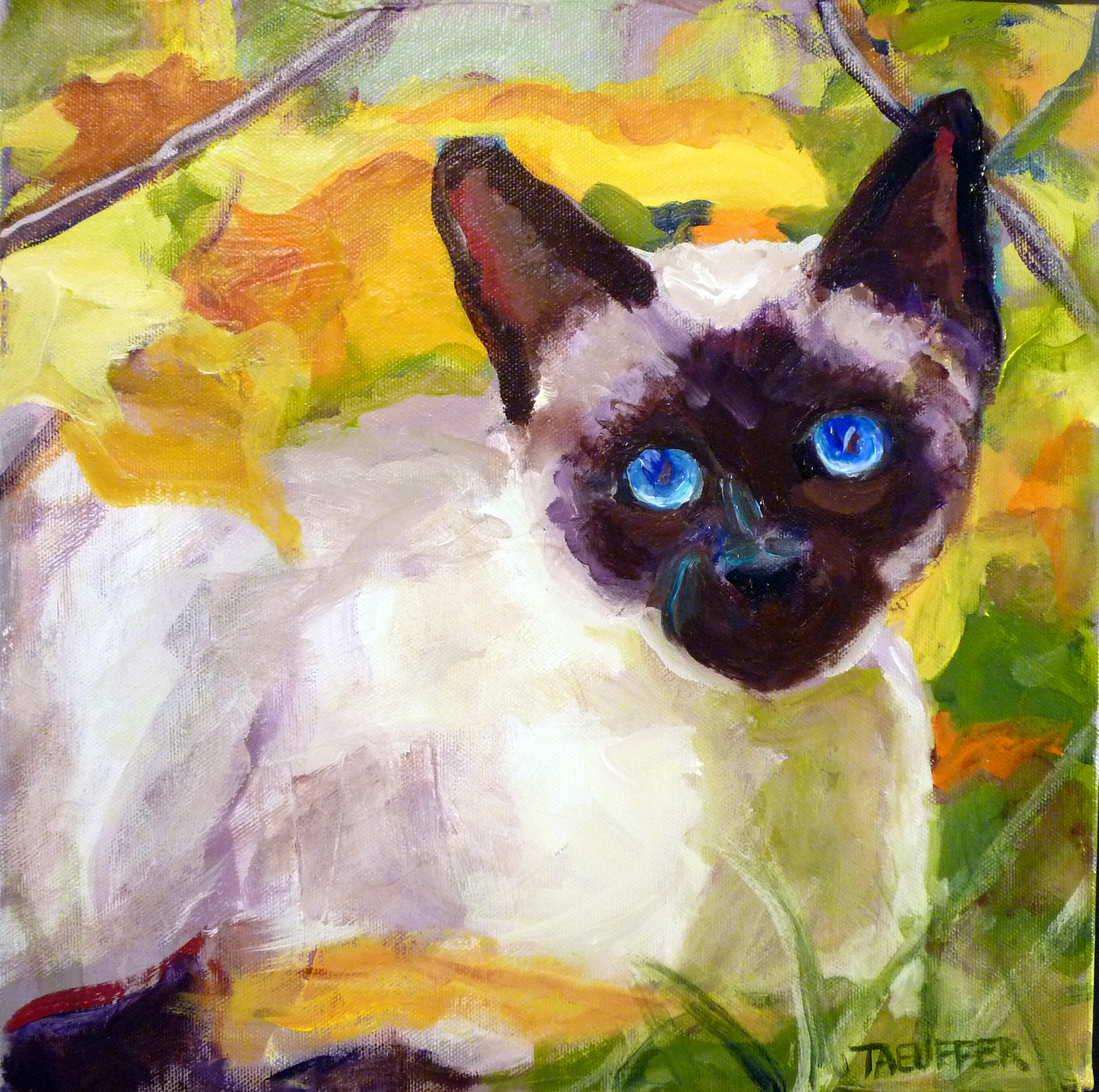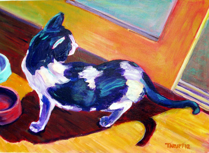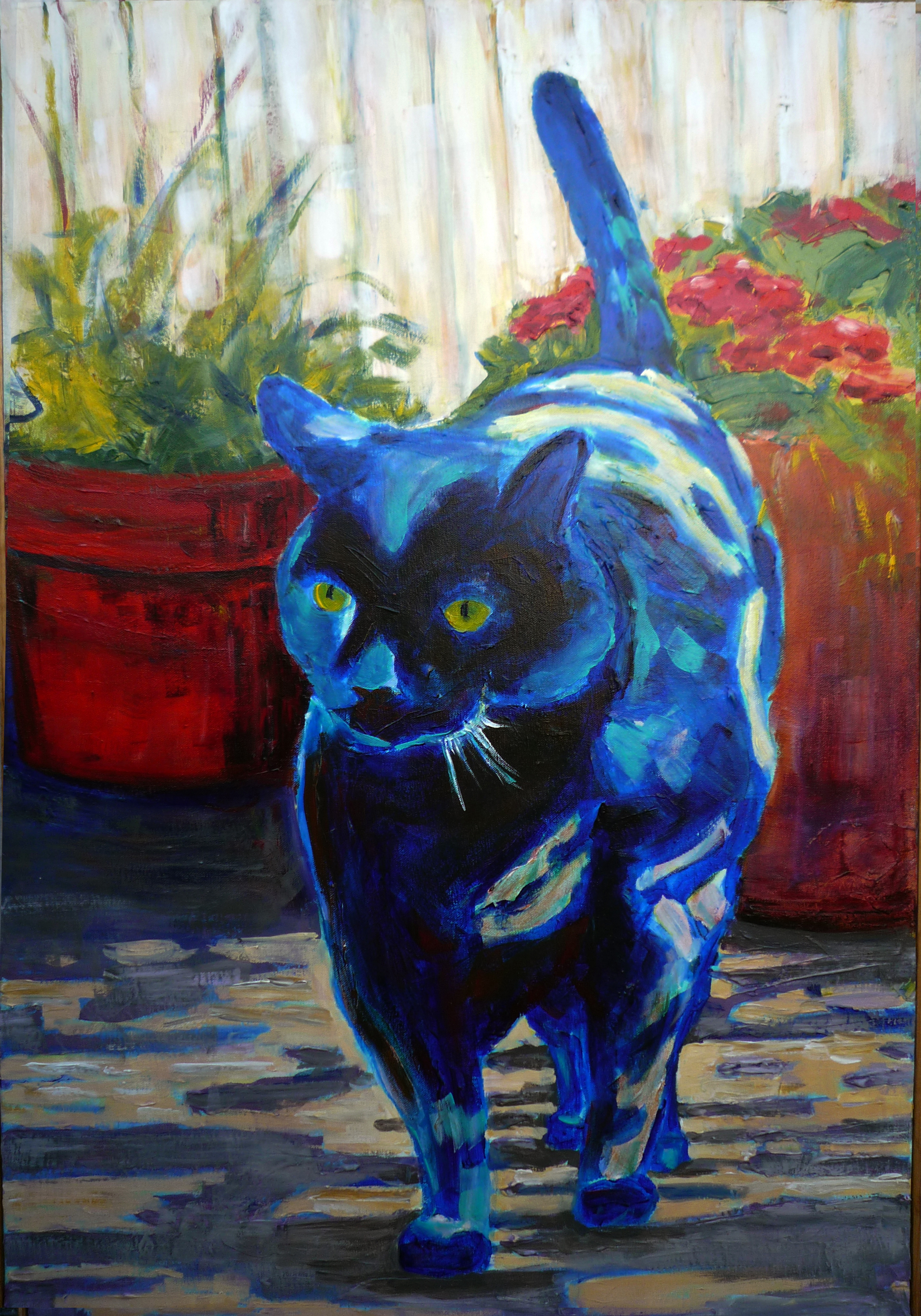 I always had the vague fear that I would end up as the eccentric old lady living in the rickety house on the corner with her 75 cats. Since becoming a painter, I’ve stopped worrying since most of my cats live on canvases. The cat paintings often use imaginary color and bold brush strokes to communicate the elegance, mystery and vibrancy of these animals. Many of the paintings depict my own cats, past and present: Alfie, the tabby; Spike, the big bruiser of a black cat, and Oscar Wild, the graceful, athletic black cat (who is featured in Oscar’s Excellent Year.)
